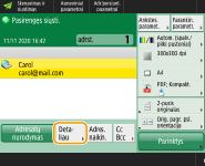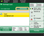 Pagrindinių skenavimo funkcijų ekrane nurodykite adresatą.  Pagrindinių nuskaitymo funkcijų ekranas