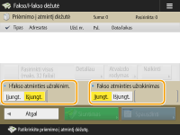 Norėdami atspausdinti visus atmintyje esančius dokumentus, paspauskite parametro <Fakso atminties užrakinimas> arba <I-fakso atminties užrakinim.> reikšmę <Išjungt.>. Galite praleisti 5 veiksmą.