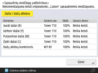 Remiantis naudojimo istorija, lauke <Likusios dienos> rodomas prognozuojamas skaičius dienų, likusių iki tol, kol reikės pakeisti. Net jei lauke Likusios dienos rodoma Reikia keisti., nekeiskite, kol būsenos rodymo srityje (jutiklinio ekrano apačioje) nebus rodomas pranešimas, raginantis pakeisti eksploatacines medžiagas. Pradėjus veikti aparatui, kurį laiką vyks <Likusios dienos> skaičiavimas, todėl šiuo metu bus rodoma <1 m. ar daugiau>. Tada rodomas likusių dienų skaičius kurį laiką gali būti ypač mažas. |