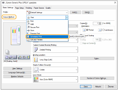 ![]() | Galite nustatyti spausdinimo pradžios laiką, o tai naudinga, kai spausdinate didelius kiekius dokumentų naktį ir pan. |