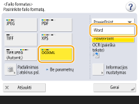 Šis režimas leidžia atlikti OCR (optinio rašto simbolių atpažinimo) funkciją ir iš nuskaityto atvaizdo paimti duomenis, kuriuos galima atpažinti kaip tekstą, ir sukurti PDF/XPS/OOXML (pptx/docx) failą, kuriame būtų galima atlikti paiešką. Taip pat galite nustatyti <Kompakt.> jei kaip failo formatą pasirinkote PDF arba XPS.