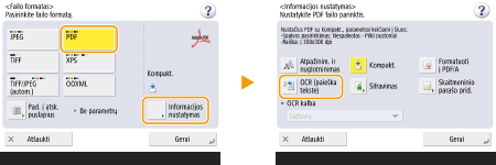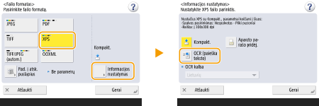 Jei pasirinkote <PDF> ar <XPS> kaip failo formatą, galite nustatyti <Kompakt.> ir <OCR (paieška tekste)> vienu metu. Tokiu atveju <PDF; Kompakt.> ar <XPS; Kompakt.> rodoma kaip failo formatas nuskaitymo ir siuntimo pagrindinių savybių ekrane.