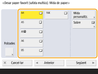 Si <Especificar sempre> a <Opcions predeterminades safata multiús> s'estableix en <Paper favorit>, una pantalla emergent permet seleccionar l'opció "Paper favorit" quan carregueu el paper a la safata multiús. <Opcions predeterminades safata multiús> |