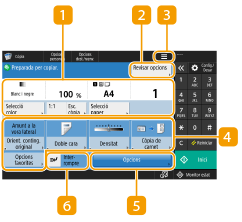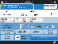 Mostra l'estat de l'opció, com l'escala de còpia, la mida de paper i el nombre de còpies. Assegureu-vos de confirmar les opcions per copiar correctament. Per modificar les opcions, premeu el botó que hi ha a sota de la secció de la pantalla.