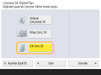 1 | <Kitap Çerç. Sil> seçeneğine basın ve <Orijinal Boyut> seçeneğini onaylayın. ![]() <Orijinal Boyut> bölümünde gösterilen boyut ayarladığınız kitabın boyutundan farklıysa, boyutu seçmek için <Değiştir> seçeneğine basın. |