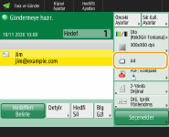 Taramadan sonra <Tek Dokunuş> ekranından bir hedef seçmek için, <Varsayılan Ekran> için <Tek Dokunuş> ayarlayın. Taranan belgelerin aynı hedefe gönderilmesi için gereken iş yükü azaltılabilir. <Gönder> Sunucu makinenin tek dokunuş düğmelerinde kaydedilen hedefler aşağıdaki zamanlarda güncellenir: İstemci makineye bir faks işi gönderildiğinde İstemci makinede (Sıfırla) seçeneğine bastığınızdaİstemci makinede Otomatik Sıfırlama etkinleştirildiğinde |