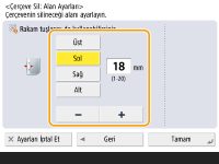 <Çerçeveyi Sil> seçeneğine basın.1 | <Orijinal Çerçeveyi Sil> seçeneğine basın ve <Orijinal Boyut> seçeneğini kontrol edin. ![]() <Orijinal Boyut> bölümünde gösterilen boyut orijinalin boyutundan farklıysa, boyutu seçmek için <Değiştir> seçeneğine basın. Yalnızca dokunmatik panel ekranda gösterilen orijinal boyutları taranabilir. |