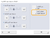 يمكنك ضبط مستوى الأصوات الصادرة عن الجهاز عند إرسال/استقبال فاكس. وبالإضافة إلى ضبط أصوات الفاكس، يمكنك تحديد إصدار سواء أصوات تأكيد وتحذير أم لا.