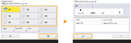 لوظيفة نسخ/مسح ضوئي والإرسال، يمكنك أيضًا تعيين الجهاز إلى عدم عرض شاشة التأكيد عند استدعاء الإعدادات المسجلة.