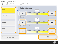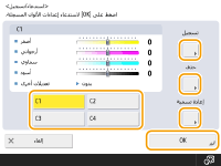 يُمكنك تسجيل ما يصل إلى أربعة إعدادات بعد الضبط. بعد ضبط اللون، اضغط على <استدعاء/تسجيل> وحدد أحد الأزرار من <C1> إلى <C4> ثم اضغط على <تسجيل> <نعم> <موافق>.![]() ![]() لاستدعاء الإعدادات المسجلة، اضغط على <استدعاء/تسجيل>، حدد زرًا، ثم اضغط على <موافق>. يُمكنك تغيير أسماء الأزرار من <C1> إلى <C4>. حدد الزر المراد تغييره، واضغط على <إعادة تسمية>، ثم أدخل اسمًا جديدًا. لحذف الإعدادات المسجلة، حدد الزر واضغط على <حذف> <نعم>. |