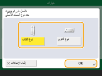 1 | اضغط على <مسح إطار الكتاب> وتحقق من <حجم المستند الأصلي>. ![]() إذا اختلف الحجم المعروض في <حجم المستند الأصلي> عن حجم الكتاب، فاضغط على <تغيير> لتحديد الحجم. يمكنك فقط تعيين وضع مسح إطار الكتاب لأحجام المستندات الأصلية الموضحة على لوحة الإدخال باللمس. |
