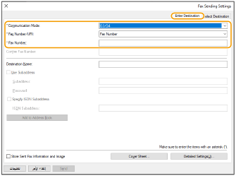 انقر فوق نافذة [إدخال وجهة]، وحدد وضع الاتصال ورقم الفاكس الذي تستخدمه.