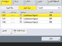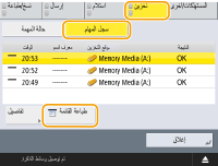 (شاشة الحالة)، تظهر شاشة مراقبة الحالة، مما يتيح لك التحقق من سجل استخدام كل وظيفة، مثل النسخ والطباعة وإرسال بريد إلكتروني وإرسال/استقبال فاكسات/فاكسات إنترنت، وغير ذلك. ومن هذه الشاشة، يُمكنك أيضًا طباعة سجل استخدام كل وظيفة.![]() |