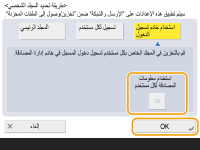 تسجيل مجلد شخصي ومعلومات مصادقة لكل مستخدمإذا تم تعيين <طريقة تحديد المجلد الشخصي> على <تسجيل لكل مستخدم>، فقم بتسجيل أحد ما يلي كمجلد شخصي لكل مستخدم. تكون الإعدادات المسجلة متماثلة ويتم تسجيل نفس المجلد الشخصي، بغض النظر عن مكان تكوين الإعداد. <مسح ضوئي وإرسال> <تسجيل/تحرير معلومات كل مستخدم> <مجلد شخصي><مسح ضوئي وتخزين> <الشبكة> <تسجيل/تحرير معلومات كل مستخدم> <مجلد شخصي><الوصول إلى الملفات المخزنة> <الشبكة> <تسجيل/تحرير معلومات كل مستخدم> <مجلد شخصي> |