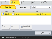 يمكّنك الضغط على <تفاصيل> <إعادة إرسال> من إعادة إرسال/إعادة حفظ المستندات التي فشل إرسالها/حفظها. لتحديد وجهة أخرى، اضغط على <تغيير الوجهة>. بالنسبة للمستندات ذات وجهات متعددة محددة باستخدام طريقة الإرسال/الحفظ نفسها، اضغط على <قائمة الإرسال>، حدد وجهة، ثم اضغط على <إعادة إرسال> أو <تغيير الوجهة>.يمكنك إعادة إرسال/إعادة حفظ المستندات عند ضبط <حذف مهام الإرسال الفاشلة> على <إيقاف>. <حذف مهام الإرسال الفاشلة> يمكنك تغيير وجهات المستندات التي تم ضبطها ليتم إرسالها/حفظها في وقت محدد وكذلك المستندات التي فشل إرسالها/حفظها. لاحظ أنه لا يمكنك تغيير وجهات المستندات التي تحتوي على وجهات متعددة محددة يتم إرسالها/حفظها، أو عند إدخال وجهة جديدة مقيدة (تقييد الوجهات الجديدة). |