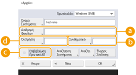 1 | Εισαγάγετε το όνομα συστήματος του διακομιστή αρχείων/Προηγμένη Θυρίδα που αποστέλλει δεδομένα. ![]() Ζητήστε πληροφορίες από τον διαχειριστή του δικτύου σας σχετικά με τον διακομιστή αρχείων/Προηγμένη Θυρίδα. <Πρωτόκολλο>Επιλέξτε ένα πρωτόκολλο για τον διακομιστή αρχείων από το <Windows (SMB)>, <FTP> και το <WebDAV>. Κατά την αποστολή ενός εγγράφου στο Προηγμένη Θυρίδα, επιλέξτε <Windows (SMB)> ή <WebDAV>. ![]() Εάν επιλέξετε <Windows (SMB)>, εμφανίζονται τα πλήκτρα <Αναζήτηση Συστήματος> και <Αναζήτηση>. Μπορείτε εύκολα να καθορίσετε έναν διακομιστή αρχείων/Προηγμένη Θυρίδα μέσω αναζήτησης ή προβολής του δικτύου. Μπορείτε να χρησιμοποιήσετε <Αναζήτηση> μόνο εάν ορίσετε <1.0> σε <On> σε <Ορισμός Έκδοσης Πελάτη SMB>. Μπορείτε να αποθηκεύσετε έως πέντε διακομιστές καταλόγου που θα χρησιμοποιούνται στο <Αναζήτηση>. <Όνομα Συστήματος>Εισαγάγετε το όνομα συστήματος του διακομιστή αρχείων/Προηγμένη Θυρίδα. Εάν επιλέξετε <FTP> για το πρωτόκολλο, εισαγάγετε το <Όνομα κεντρικού υπολογιστή> ως εξής. Εάν το TLS είναι απενεργοποιημένο Παράδειγμα: Για αποθήκευση στον κοινόχρηστο χώρο: ftp://<όνομα κεντρικού υπολογιστή>/share Για αποθήκευση στον προσωπικό χώρο: ftp://<όνομα κεντρικού υπολογιστή>/users Εάν το TLS είναι ενεργοποιημένο Παράδειγμα: Για αποθήκευση στον κοινόχρηστο χώρο: ftps://<όνομα κεντρικού υπολογιστή>/share Για αποθήκευση στον προσωπικό χώρο: ftps://<όνομα κεντρικού υπολογιστή>/users Κατά την αποστολή ενός εγγράφου στο Προηγμένη Θυρίδα, εισαγάγετε το <Όνομα Συστήματος> όπως περιγράφεται παρακάτω. Εάν επιλέξετε <Windows (SMB)> για το πρωτόκολλο Παράδειγμα: Για αποθήκευση στον κοινόχρηστο χώρο: \\192.168.100.50\share Για αποθήκευση στον προσωπικό χώρο: \\192.168.100.50\users Αν εάν επιλέξετε <WebDAV> για πρωτόκολλο, εισαγάγετε <Όνομα Συστήματος> ως εξής και πατήστε <Επόμενο>. Εάν το TLS είναι απενεργοποιημένο Παράδειγμα: Για αποθήκευση στον κοινόχρηστο χώρο: http://<διεύθυνση IP ή όνομα συστήματος>/ Για αποθήκευση στον προσωπικό χώρο: http://<διεύθυνση IP ή όνομα συστήματος>/ Εάν το TLS είναι ενεργοποιημένο Παράδειγμα: Για αποθήκευση στον κοινόχρηστο χώρο: https://<διεύθυνση IP ή όνομα συστήματος>/ Για αποθήκευση στον προσωπικό χώρο: https://<διεύθυνση IP ή όνομα συστήματος>/ <Έλεγχος Σύνδεσης>Πατήστε αυτό το κουμπί μετά την εισαγωγή του ονόματος κεντρικού συστήματος για να επιβεβαιώσετε τη σύνδεση με τον διακομιστή αρχείων/Προηγμένη Θυρίδα. ![]() Αν χρησιμοποιείτε μια υπηρεσία σύνδεσης, όπως η διαχείριση ατομικής πιστοποίησης, πρέπει να εισαγάγετε <Όνομα Χρήστη> και <Συνθηματικό>. |