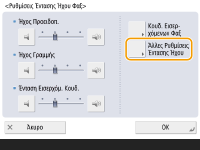 <Ήχος Προειδοπ.>Ρυθμίστε την ένταση ήχου που παράγεται κατά την ακύρωση της αποστολής φαξ ή όταν ολοκληρωθεί η εκτύπωση ενός εισερχόμενου φαξ. Εάν δεν θέλετε να εκπέμπεται ένας ήχος, μετακινήστε το