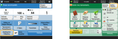 Μπορείτε να αλλάξετε τα πλήκτρα ρυθμίσεων που εμφανίζονται στις οθόνες βασικών λειτουργιών (για αντιγραφή, φαξ και σάρωση). Μπορείτε επίσης να εμφανίσετε μια διαφορετική οθόνη βασικών λειτουργιών, προσαρμοσμένη για κάθε συνδεδεμένο χρήστη.