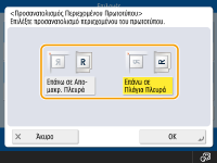 Για να ορίσετε τον προσανατολισμό του εγγράφου, πατήστε <Ορισμός Λεπτομερειών>. Επιλέξτε <Τύπος Βιβλίου> ώστε να ρυθμίσετε την εμπρός και πίσω όψη του εγγράφου για να έχουν ίδιο προσανατολισμό επάνω-κάτω. Επιλέξτε <Τύπος Ημερολογίου> αν η μπροστινή και πίσω πλευρά του εγγράφου έχουν αντίθετο προσανατολισμό επάνω-κάτω.
