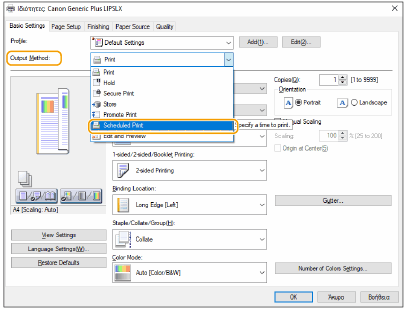 ![]() | Μπορείτε να ορίσετε την ώρα εκκίνησης της εκτύπωσης, κάτι που είναι χρήσιμο για την εκτύπωση μεγάλου όγκου εγγράφων, την εκτύπωση κατά τη διάρκεια της νύχτας, κ.λπ. |