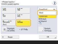 1 | Επιλέξτε <OOXML> επιλέξτε <Word> από την αναπτυσσόμενη λίστα.![]() ![]() Για να αλλάξετε μια γλώσσα που χρησιμοποιείται για το OCR, πατήστε <Ορισμός Λεπτομερειών> <Αλλαγή> επιλέξτε μια γλώσσα ή μια γλωσσική ομάδα και πατήστε <OK>. |