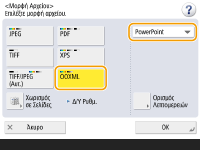 1 | Επιλέξτε <OOXML> επιλέξτε <PowerPoint> από την αναπτυσσόμενη λίστα.![]() ![]() Για να αλλάξετε τη γλώσσα που χρησιμοποιείται για το OCR, πατήστε <Ορισμός Λεπτομερειών> <Αλλαγή> επιλέξτε τη γλώσσα πατήστε <OK>. |
