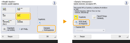 Ρυθμίσεις γλώσσας για αναγνώριση χαρακτήρων | Όταν καθορίζεται μια γλώσσα με το OCR επιλεγμένο στη <Μορφή Αρχείου>: Οι χαρακτήρες αναγνωρίζονται με βάση τη γλώσσα που επιλέγετε για κάθε μορφή αρχείου. Όταν δεν καθορίζεται μια γλώσσα με το OCR επιλεγμένο στη <Μορφή Αρχείου>: Οι χαρακτήρες αναγνωρίζονται με βάση τη γλώσσα που επιλέγετε στο <Αλλαγή Γλώσσας/Πληκτρολογίου> (<Αλλαγή Γλώσσας/Πληκτρολογίου>).*1 |