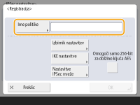 Ne glede na nastavitev možnosti <Format. metode kodiranja na FIPS 140-2> za komunikacijo prek protokola IPSec se uporabi modul šifriranja, ki je že pridobil potrdilo FIPS 140-2. Če želite, da je komunikacija prek protokola IPSec skladna s standardom FIPS 140-2, morate za komunikacijo prek protokola IPSec dolžino ključa za DH in RSA v omrežnem okolju, v katerem je naprava, nastaviti na 2048-bitno ali daljšo. V napravi je mogoče nastaviti samo dolžino ključa za DH. Zabeležite pri konfiguriranju okolja, saj v napravi ni nastavitev za RSA. Registrirate lahko do 10 varnostnih pravilnikov. |