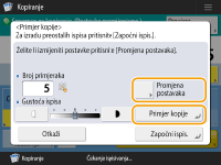 Pritisnite <Promjena postavaka> da biste promijenili postavke. Prikazuje se <Primjer kopije> nakon promjene postavki. Ponovno kopirajte uzorak.