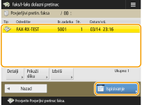 ![]() | Ova funkcija sprema primljene dokumente koji odgovaraju definiranim uvjetima na određenu lokaciju za pohranu (Povjerljivi faks pretinac). Povjerljivi faks pretinac sadrži više pretinaca, a svaki je moguće zaštititi lozinkom. Definiranjem uvjeta poput spremanja svih dokumenata tvrtke A u pretinac br. 10, smijete provjeravati samo dokumente koje trebate. Ova funkcija omogućava vam sprečavanje neovlaštenih osoba da slučajno vide povjerljive dokumente tako da postavite lozinku. Kad indikator Obrada/podaci na upravljačkoj ploči svijetli stalnim zelenim svjetlom, slijedite sljedeće postupke da biste provjerili/ispisali dokumente. |