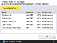 Preostalu količinu potrošnog materijala možete provjeriti i putem značajke Remote UI. Provjera statusa uređaja |