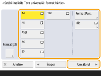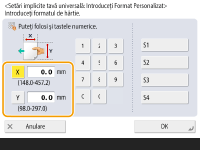 Apăsaţi <X> sau <Y> pentru a introduce lungimea fiecărei părţi utilizând tastele numerice. ![]() Dacă înregistraţi formatul de hârtie pe care îl utilizaţi frecvent pe butoanele <S1> – <S4>, puteţi să le apelaţi cu o singură atingere. Înregistrarea unui format liber de hârtie (format personalizat) | |