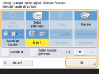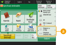 Numărul de articole de setare amplasate în ecranul Caracteristici de bază şi locul afişării depind de fiecare funcţie. Butonul de comenzi rapide nu se va afişa dacă <Neatribuit> s-a setat ca o comandă rapidă. Limita numărului de comenzi rapide pentru <Opţiuni> pe care le puteţi înregistra este după cum urmează. Copiere: 5 Fax: 4 Scanare şi Transmitere: 2 |