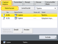 Dacă apăsaţi (Stop)pe panoul de control când lucrările de copiere sunt în aşteptare, toate lucrările de copiere sunt întrerupte şi se afişează mesajul <<Stop>Selectaţi lucrarea de copiere de anulat.> şi lista lucrărilor de copiere. Puteţi să selectaţi din listă o lucrare de copiere şi să o anulaţi apăsând <Anulare>. Dacă doriţi să reluaţi copierea, apăsaţi <Reluare copiere>. |