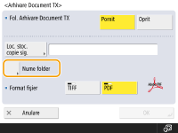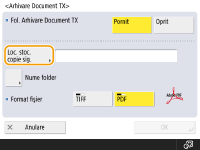 Nu puteţi efectua transmiterea directă dacă setaţi <Arhivare Document TX> la <On>. Această setare comută automat la <Oprit> în următoarele cazuri. Specificaţi din nou destinaţia sau readuceţi setarea la <Pornit> după caz. Când destinaţia de rezervă a fost ştearsă din agendă Când o agendă a fost importată din IU la distanţă Importul/exportul setărilor Când a fost primită o agendă de la software-ul de gestionare a agendei. <Import/Export de la Software Gestionare Agendă> |