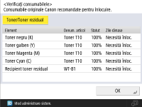 <Zile rămase> afişează numărul preconizat de zile rămase până când este necesară înlocuirea, pe baza utilizării anterioare. Chiar dacă opţiunea <Necesită Înloc.> este afişată în <Zile rămase>, nu efectuaţi înlocuirea până când un mesaj care vă solicită să înlocuiţi consumabilele nu este afişat în zona afişării de stare (în partea de jos a afişajului panoului tactil). Măsurătoarea pentru <Zile rămase> nu se finalizează o perioadă de timp după ce aparatul începe să funcţioneze şi <1 an/mai mult> se afişează în timpul acestei perioade de timp. Restul de zile afişate după acest timp poate fi extrem de mic din punct de vedere temporar. |