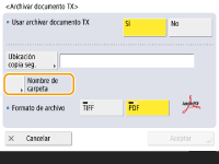 Puede seleccionar <Información de remitente>, <Fecha> o <No> para categorizar los nombres de carpeta. <Archivar documento TX>