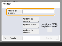 Se utilizará un módulo de cifrado que haya obtenido previamente la certificación FIPS140-2, independientemente de la configuración de <Establ. método de cifrado como FIPS 140-2> para la comunicación IPSec. Para cumplir con FIPS 140-2, debe establecer la longitud de la clave, tanto de DH como RSA, para la comunicación IPSec en 2048 bits o superior para el entorno de red al que pertenezca el equipo. Solo puede especificarse desde el equipo la longitud de la clave para DH. Téngalo en cuenta durante la configuración de su entorno, ya que no hay opciones para la RSA en el equipo. Puede registrar hasta 10 políticas de seguridad. |