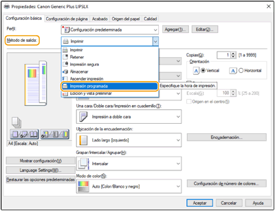 Puede establecer una hora para iniciar la impresión, que resultará útil al imprimir grandes cantidades de documentos por la noche, etc.
