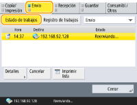 Si pulsa <Detalles> <Volver a enviar> podrá volver a enviar/guardar los documentos que no se han podido enviar/guardar. Para especificar otro destino, pulse <Cambiar destino>. Para documentos con múltiples destinos especificados con el mismo método de envío/guardado, pulse <Lista de difusión>, seleccione un destino y luego pulse <Volver a enviar> o <Cambiar destino>.Puede volver a enviar/guardar documentos si <Eliminar trabajos de TX fallida> está establecido en <No>. <Eliminar trabajos de TX fallida> Puede cambiar los destinos de documentos que están configurados para ser enviados/guardados en un momento concreto, así como los documentos que no se han podido enviar/guardar. Tenga en cuenta que no puede cambiar los destinos de documentos con múltiples destinos especificados que se están enviando/guardando, o cuando la introducción de un nuevo destino está restringida (Restringir nuevos destinos). |