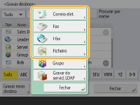 Múltiplos destinos registrados no Catálogo de endereços podem ser combinados em um grupo. Para detalhes, consulte Registrando Destinos Múltiplos como um Grupo. Para alterar ou excluir as informações dos destinos registrados no Catálogo de endereços, consulte Editando os destinos registrados no Catálogo de endereços. UPN poderá ser usado somente se estiver enviando a um computador que pertence a um domínio operado com o Active Directory. |