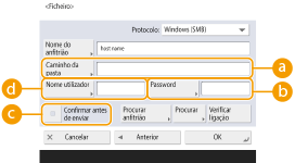 1 | Insira o nome do host do servidor de arquivos/Advanced Box que transmite os dados. ![]() Peça informações sobre o servidor de arquivos/Advanced Box ao seu Administrador de rede. <Protocolo>Selecione um protocolo para servidor de arquivo em <Windows (SMB)>, <FTP> e <WebDAV>. Quando enviar um documento a Advanced Box, selecione <Windows (SMB)> ou <WebDAV>. ![]() Se você selecionar <Windows (SMB)>, os botões <Procurar anfitrião> e <Procurar> serão exibidos. Você pode especificar facilmente um servidor de arquivos/Advanced Box pesquisando ou visualizando a rede. Você pode utilizar <Procurar> somente se definir <1.0> para <On> em <Especificar versão cliente SMB>. Você pode registrar até cinco servidores de Directory usados em <Procurar>. <Nome do anfitrião>Insira o nome do host do servidor de arquivos/Advanced Box. Se selecionar <FTP> como protocolo, insira o <Host Name> como a seguir. Quando TLS está desabilitado Exemplo: Para salvar no Espaço partilhado: ftp://<host name>/share Para salvar no Espaço Pessoal: ftp://<nome host>/users Quando TLS está habilitado Exemplo: Para salvar no Espaço partilhado: ftps://<host name>/share Para salvar no Espaço Pessoal: ftps://<nome host>/users Quando enviar um documento a Advanced Box, insira <Nome do anfitrião> da seguinte maneira. Se selecionar <Windows (SMB)> como protocolo Exemplo: Para salvar no Espaço Compartilhado: \\192,168,100,50\compartilhamento Para salvar no Espaço Pessoal: \\192,168,100,50\usuários Se selecionar <WebDAV> como protocolo, insira <Nome do anfitrião> como a seguir e pressione <Seguinte>. Quando TLS está desabilitado Exemplo: Para salvar no Espaço partilhado: http://<endereço IP ou host name>/ Para salvar no Espaço Pessoal: http://<endereço IP ou nome host>/ Quando TLS está habilitado Exemplo: Para salvar no Espaço partilhado: https://<endereço IP ou host name>/ Para salvar no Espaço Pessoal: https://<endereço IP ou nome host>/ <Verificar ligação>Pressione este botão após inserir o nome do host para confirmar a conexão com o servidor de arquivos/Advanced Box. ![]() Se estiver usando um serviço de login, como um gerenciamento de autenticação pessoal, será necessário inserir <Nome do utilizador> e <Password>. |