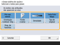 O número de itens de configuração localizados na tela de Recursos básicos e o local de exibição variam de acordo com as funções. Um botão de atalho não será exibido se <Unassigned> estiver configurado como atalho. O limite do número de atalhos para <Opções> que você pode registrar é o seguinte: Cópia: 5 Fax: 4 Digitalização e envio: 2 |