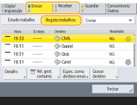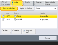 Pressionar <Details> <Reenviar> possibilita reenviar os documentos que não foram enviados. Para especificar outro destino, pressione <Alterar destino>. Para documentos com vários destinos especificados usando o mesmo método de envio, pressione <Lista destinos envio>, selecione um destino e pressione <Reenviar> ou <Alterar destino>.É possível reenviar documentos quando <Apagar trabalhos TR. falhados> está configurado como <Off> (<Apagar trabalhos TR. falhados>). Observe que não é possível reenviar os documentos enviados com Envio direto/Envio manual/Fax PC. É possível alterar os destinos de documentos que estão configurados para envio em uma hora especificada, bem como documentos que não foram enviados com êxito. Observe que não é possível alterar os destinos de documentos com múltiplos destinos especificados que estejam sendo enviados ou quando a adição de um novo destino está restrita (Limitando os destinos disponíveis). O destino pode ser alterado para um trabalho cancelado por erros de transmissão ou um trabalho em espera para ser enviado no modo Envio Atrasado. Você não pode alterar múltiplos destinos de uma só vez. Além disso, você não pode alterar os destinos em um grupo de uma só vez. |