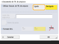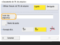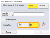 Não é possível executar Envio direto se <Documento de TR. de arquivo> está configurado como <On>. Esta configuração alterna automaticamente para <Off> nos seguintes casos. Especifique o destino novamente ou mude a configuração para <On> conforme necessário. Quando o destino de backup foi excluído do Catálogo de endereços Quando um catálogo de endereços pe importado da UI Remota Importando/exportando os dados de configurações Quando um catálogo de endereços foi recebido do Software de Gerenciamento do Livro de endereços. <Imp./exp. do softw. de gestão do livro de ender.> |