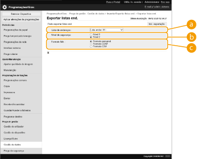3 | Defina as configurações necessárias. ![]() [Listas de endereços]Selecione as listas de endereço que serão exportadas. Observe que, depois que as listas de endereço forem salvas, os nomes das listas de endereço voltarão para o padrão de fábrica. [Nível de segurança]Você pode configurar o nível de segurança se [Formato personal.] estiver selecionado em [Formato fich.]. Quando [Nível 1] estiver selecionado, você poderá importar em todas as impressoras multifuncionais Canon. Quando [Nível 2] estiver selecionado, a senha dos dados de listas de endereço serão criptografados usando um método mais seguro do que [Nível 1]. No entanto, os dados poderão ser importados apenas nos modelos de máquina que suportam a configuração [Nível 2] (modelos nos quais a configuração [Nível de segurança] é exibida). [Formato fich.]Selecione o formato de arquivo dos dados que serão exportados. Selecione [Formato personal.] quando pretender importar todas as informações registradas nas listas de endereço em outra impressora multifuncional Canon, ou selecione [Formato LDAP] ou [Formato CSV] se o arquivo será usado por um aplicativo de computador. No entanto, note que se [Formato LDAP] estiver selecionado, apenas os endereços de e-mail e números de fax serão salvos. ![]() Para configurar uma senha para os dados exportados Configure <Incluir password ao exportar livro endereços> como <On> (<Incluir password ao exportar livro endereços>). Quando esta configuração estiver definida, os itens de entrada de senha serão exibidos na tela de [Exportar listas end.]. Se a senha tiver sido configurada, os dados poderão ser importados apenas se a senha certa for inserida. Para editar os dados exportados no formato CSV Para mais informações sobre cada coluna no catálogo de endereços, consulte Itens do catálogo de endereço. Pode não ser possível importar os dados corretamente quando a importação é feita em uma versão antiga da máquina. |