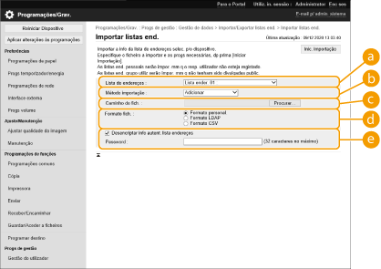 3 | Defina as configurações necessárias. ![]() [Listas de endereços]Selecione a lista de endereço que será o destino de importação. [Método importação]Selecione [Adicionar] se desejar adicionar os destinos importados sem excluir a lista de endereço atual, ou selecione [Apagar e sobrescrever] se desejar excluir a lista de endereço atual e sobrescrever os dados com os destinos importados. [Caminho do fich.]Clique em [Procurar...] e especifique os arquivos que serão importados. [Formato fich.]Selecione o formato de arquivo dos dados que serão importados. Selecione [Formato personal.] para os arquivos no formato dedicado para impressoras multifuncionais Canon (*.abk), selecione [Formato LDAP] para arquivos no formato LDAP (*.ldif) ou selecione [Formato CSV] para arquivos no formato CSV (*.csv). [Desencriptar info autent. lista endereços]Quando importar arquivos criptografados, marque a caixa de seleção e insira a mesma senha usada quando os dados de configuração foram exportados. |