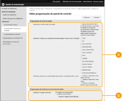 Quando a caixa de seleção [Apresentar o ecrã de início de sessão quando são selecionadas funções que requerem autenticação] está marcada e as caixas de seleção [Fax] ou [Ler e Enviar] estão marcadas em [Selecionar função que necessitará de autenticação]: