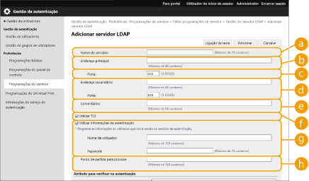 3 | Insira as informações do servidor LDAP. ![]() [Nome do servidor]Insira o nome do servidor LDAP. O nome "localhost" não pode ser usado. O nome do servidor pode não incluir espaços. [Endereço principal]Insira o endereço IP ou nome do host do servidor LDAP (Exemplo: ldap.example.com). O endereço de loopback (127.0.0.1) não pode ser usado. [Porta:]Insira o número da entrada usada para comunicação com o servidor LDAP. Use a mesma configuração do servidor. Se não inserir um número, ele será automaticamente configurado como "636" na caixa de seleção marcada como [Utilizar TLS], ou como "389" quando a caixa de seleção está em branco. [Endereço secundário:] / [Porta:]Quando usar um servidor secundário em seu ambiente, insira o endereço IP e o número da entrada. [Comentários]Insira uma descrição ou comentário se necessário. [Utilizar TLS]Marque a caixa de seleção quando usar criptografia TLS em comunicações com o servidor LDAP. [Utilizar informações de autenticação]Limpe a caixa de seleção para permitir acesso anônimo ao servidor LDAP, apenas se o servidor LDAP estiver configurado para permitir acesso anônimo. Quando usar o nome de usuário e senha para autenticação, marque a caixa de seleção e insira os valores de [Nome de utilizador:] e [Password:]. [Ponto de partida para procura:]Especifique o local (nível) da busca por informações do usuário quando a autenticação no servidor LDAP é realizada. |