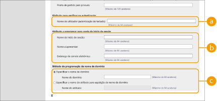 4 | Especifique como configurar os nomes de atributos e de domínio. ![]() [Nome de utilizador (autenticação de teclado):]Especifique os campos de dados LDAP (nomes de atributos) de nome de usuário no servidor LDAP (Exemplo: uid). [Nome de início de sessão:] / [Nome a apresentar] / [Endereço de correio eletrónico]Especifique os campos de dados LDAP (nomes de atributos) de nome de login, nome de exibição e endereços de e-mail de cada conta de usuário no servidor LDAP (Exemplo: uid, cn, mail). [Especificar o nome de domínio] / [Especificar o nome do atributo para aquisição do nome de domínio]Selecione como configurar o nome de domínio do destino de login. Para especificar o nome de domínio diretamente, selecione [Especificar o nome de domínio] e insira o nome de domínio. Para especificar o campo de dados LDAP (nome de atributo) de onde obter o nome de domínio do servidor LDAP, selecione [Especificar o nome do atributo para aquisição do nome de domínio] e insira o nome de atributo (Exemplo: dc). |